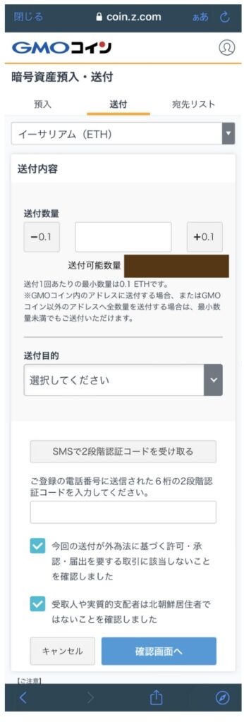 2段階認証をしてコードを入力し、注意事項を確認してチェックを入れ、「確認画面へ」をタップします。